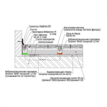 Конструкция представляет собой сборный сухой пол, состоящий деревянных лаг высотой 50 мм и двух прикрученных к ним листов фанеры 18 мм, которые склеиваются между собой эластичной мастикой. Между лагами укладывается звукопоглощающая вата Шуманет-ЭКО/СК/БМ.
