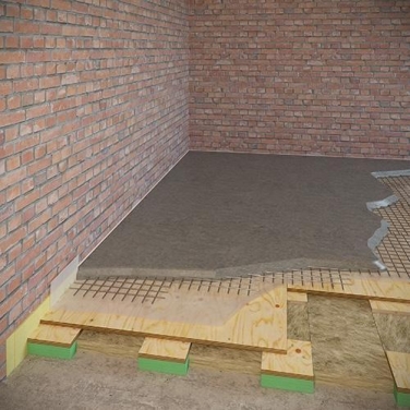 Используется при высоких динамических нагрузках на пол (например, в тренажерных залах). Конструкция состоит из слоя армированной цементно-песчаной стяжки толщиной не менее 80 мм уложенной на звукоизолирующее основание.