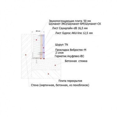 Конструкция звукоизоляционной каркасной облицовки состоит из слоя звукопоглощающих плит Шуманет-ЭКО, акустического триплекса Саундлайн-dB, финишных листов Саундлайн-ГКЛА, виброизоляционной ленты Вибростек-М 100, герметика Акуфлекс-ВС, металлических профилей CW50 и UW50. Каркас звукоизоляционной облицовки монтируется с отступом 10 мм от изолируемой стены. К ограждающим конструкциям элементы звукоизоляционной облицовки примыкают исключительно через два слоя вибродемпфирующей прокладки Вибростек-М 100.