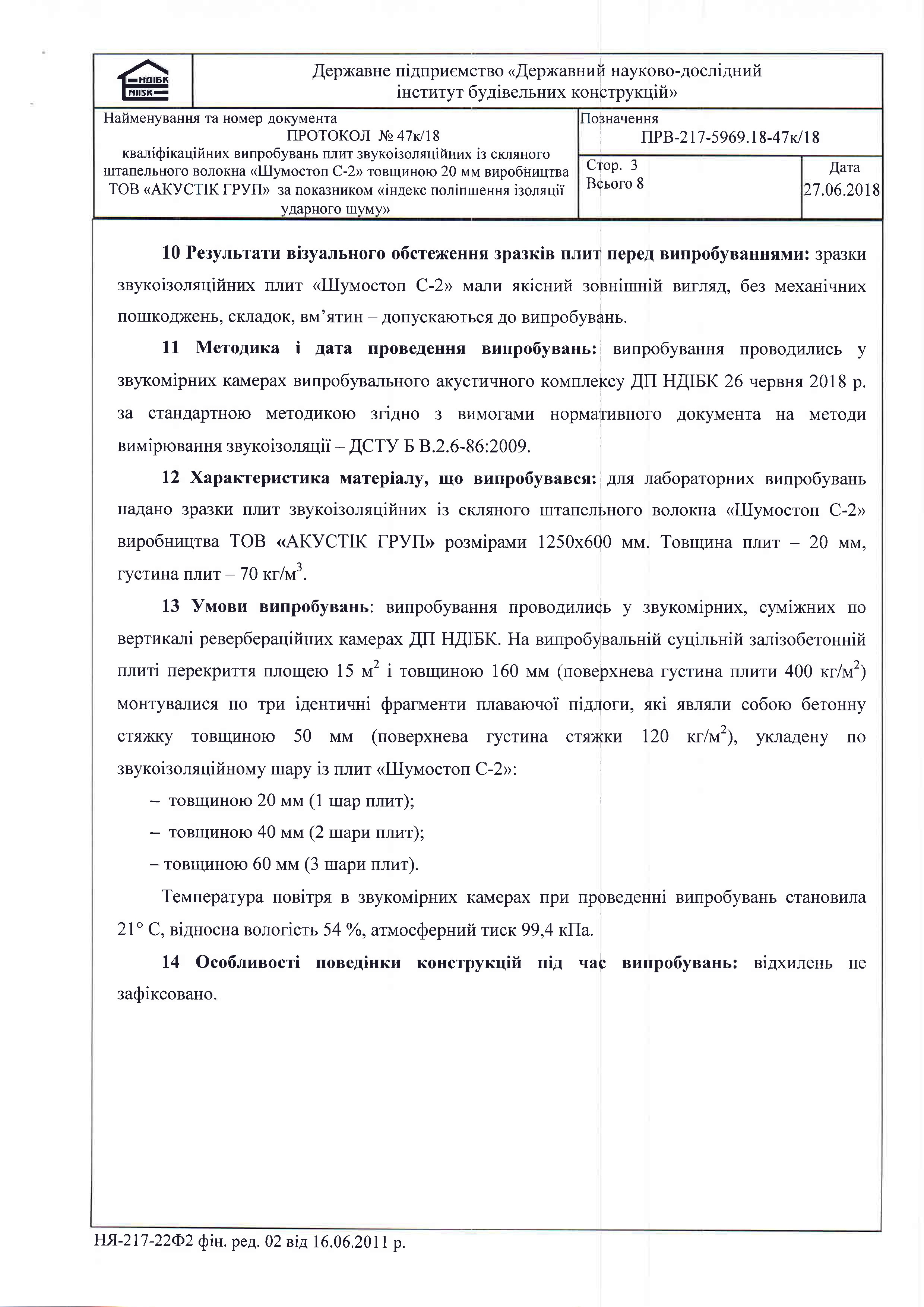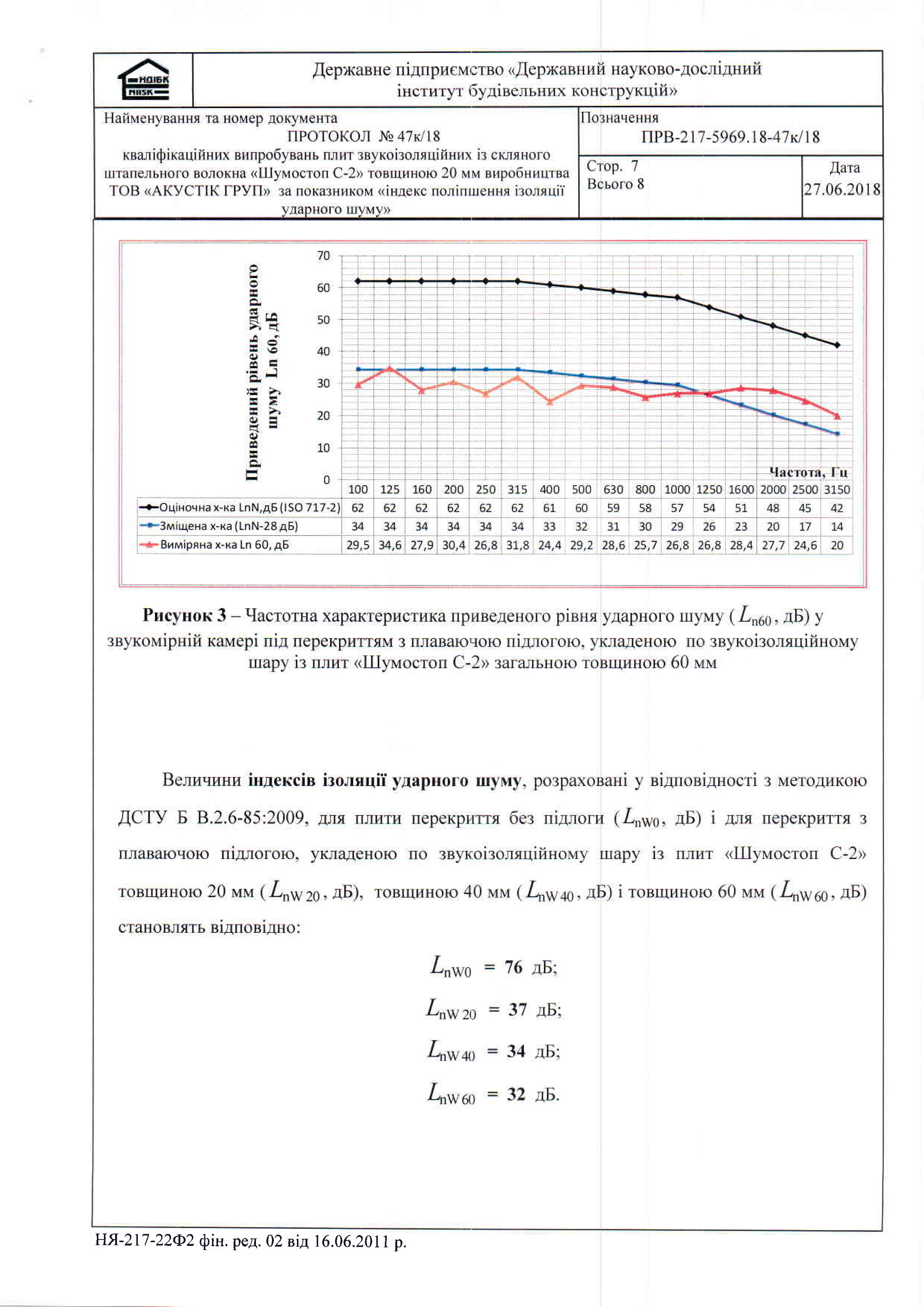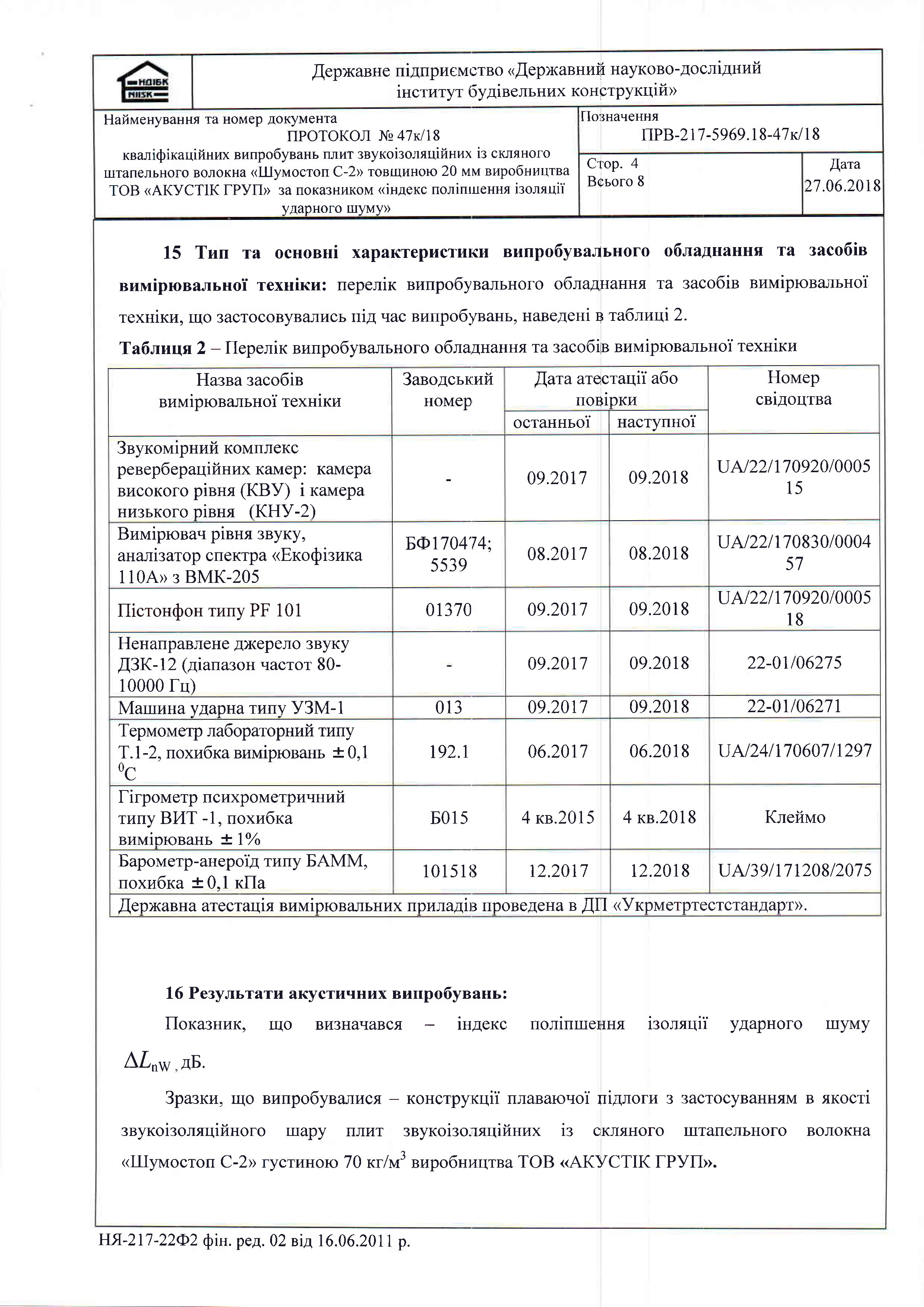 Индекс снижения уровня ударного шума в конструкции звукоизоляционного пола под стяжкой 120кг/м2 - ΔLn,w одним слоем Шумостоп-C2 = 39 дБ, двумя слоями Шумостоп-C2 = 43 дБ.