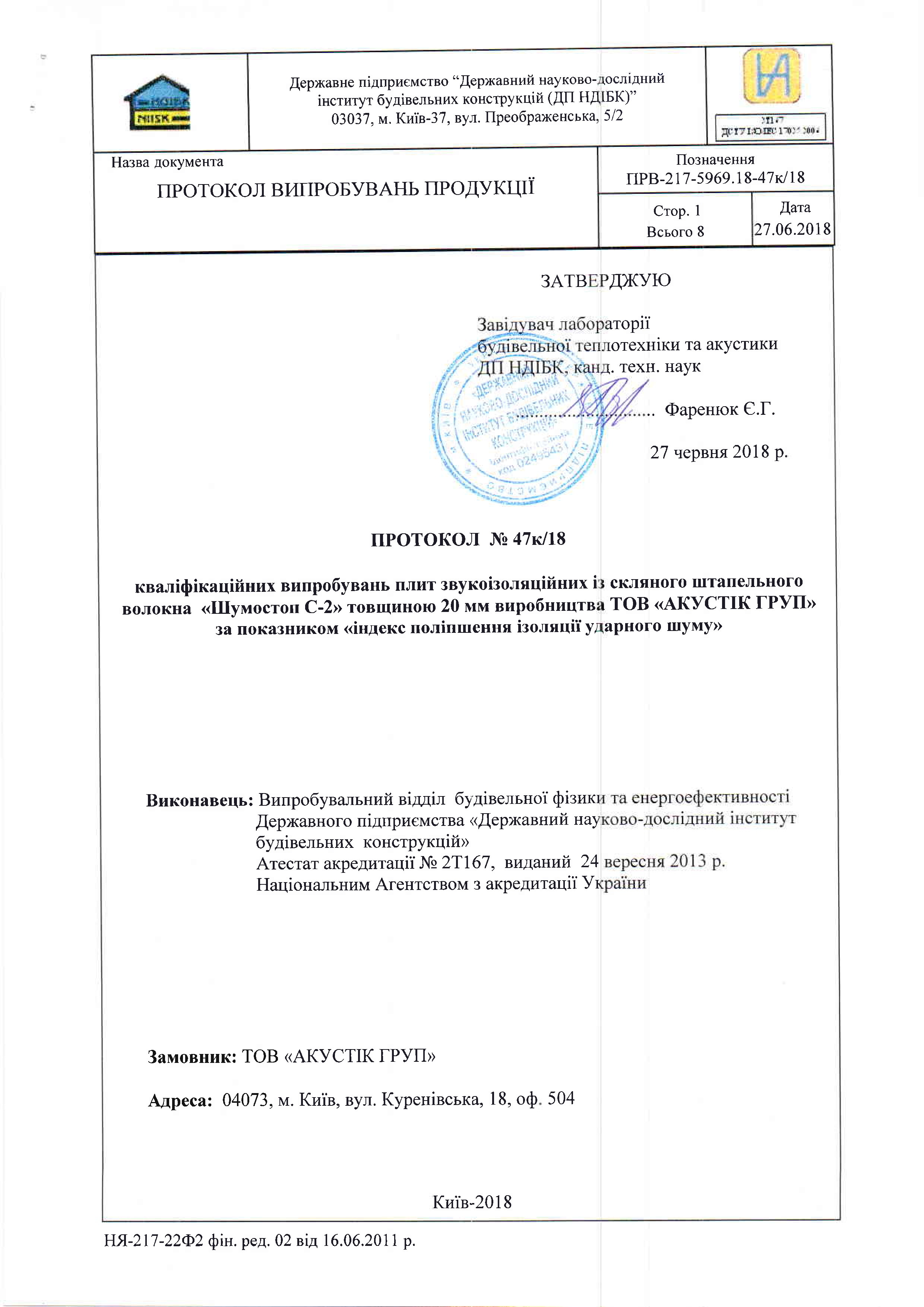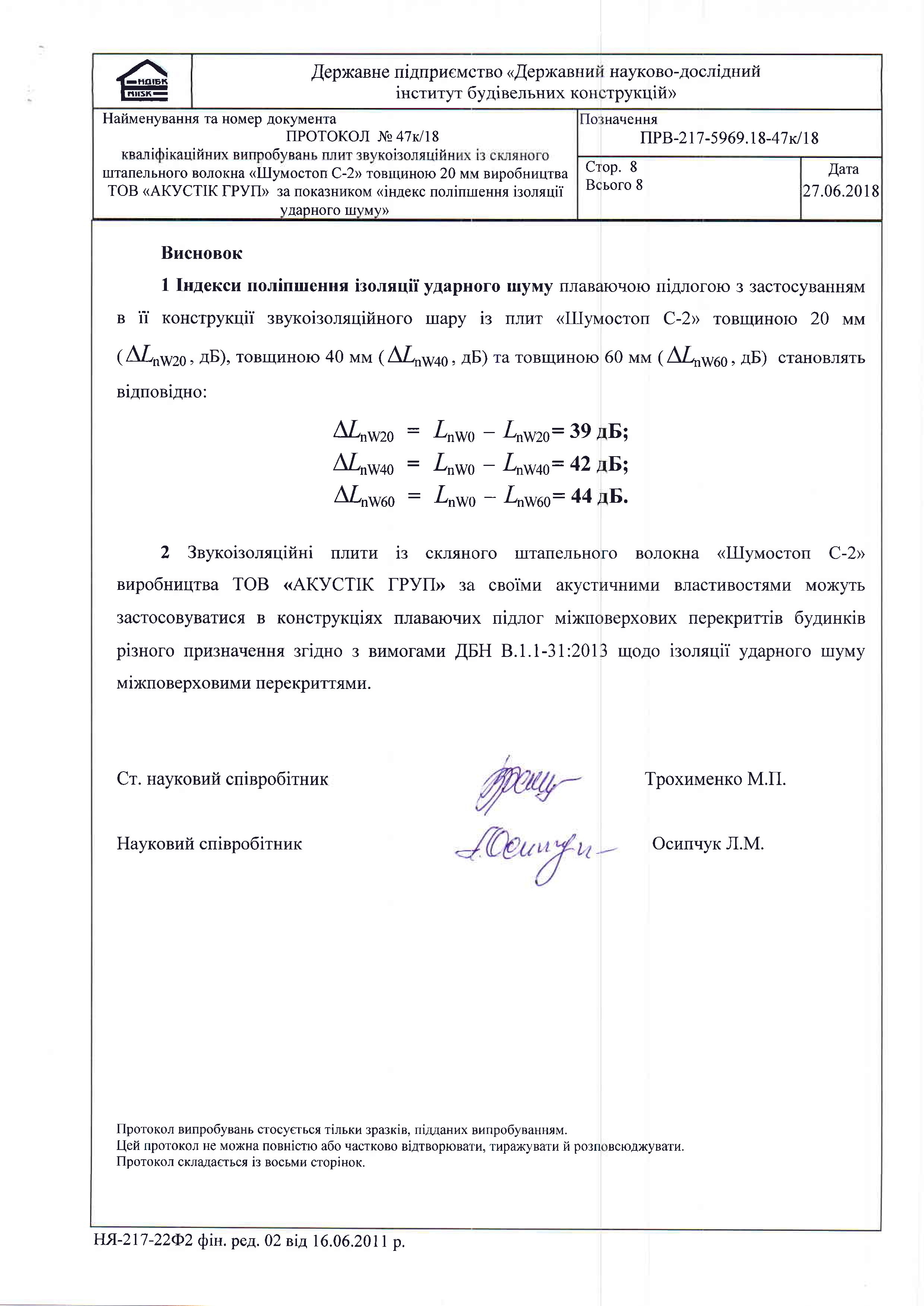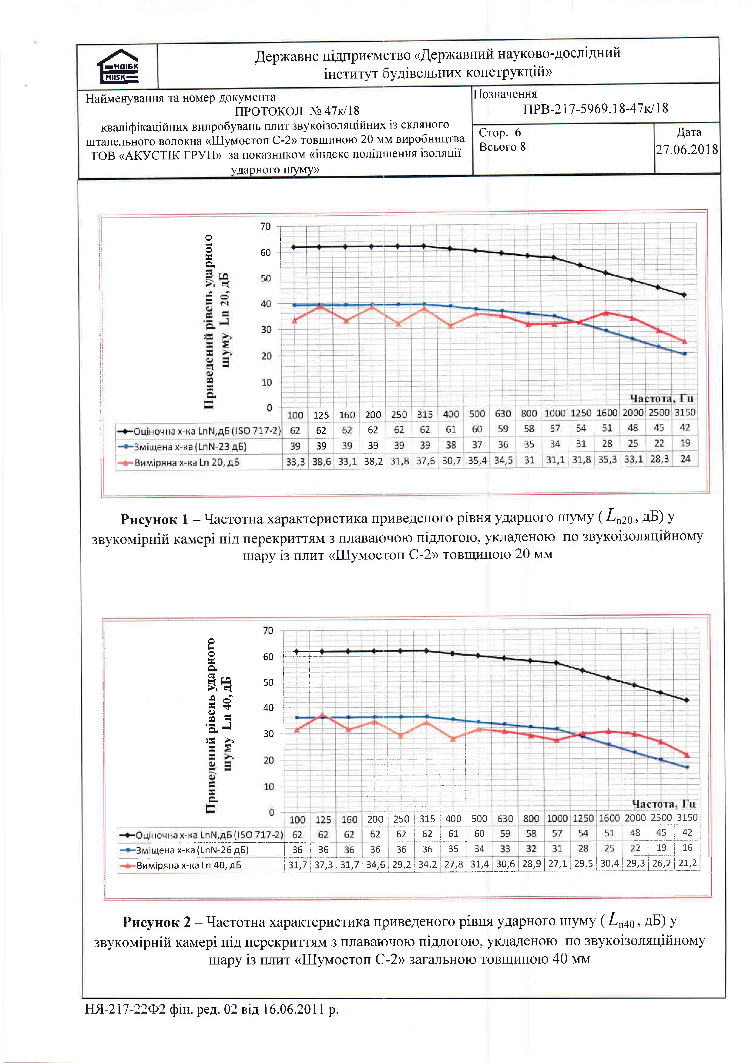 Индекс снижения уровня ударного шума в конструкции звукоизоляционного пола под стяжкой 120кг/м2 - ΔLn,w одним слоем Шумостоп-C2 = 39 дБ, двумя слоями Шумостоп-C2 = 43 дБ.