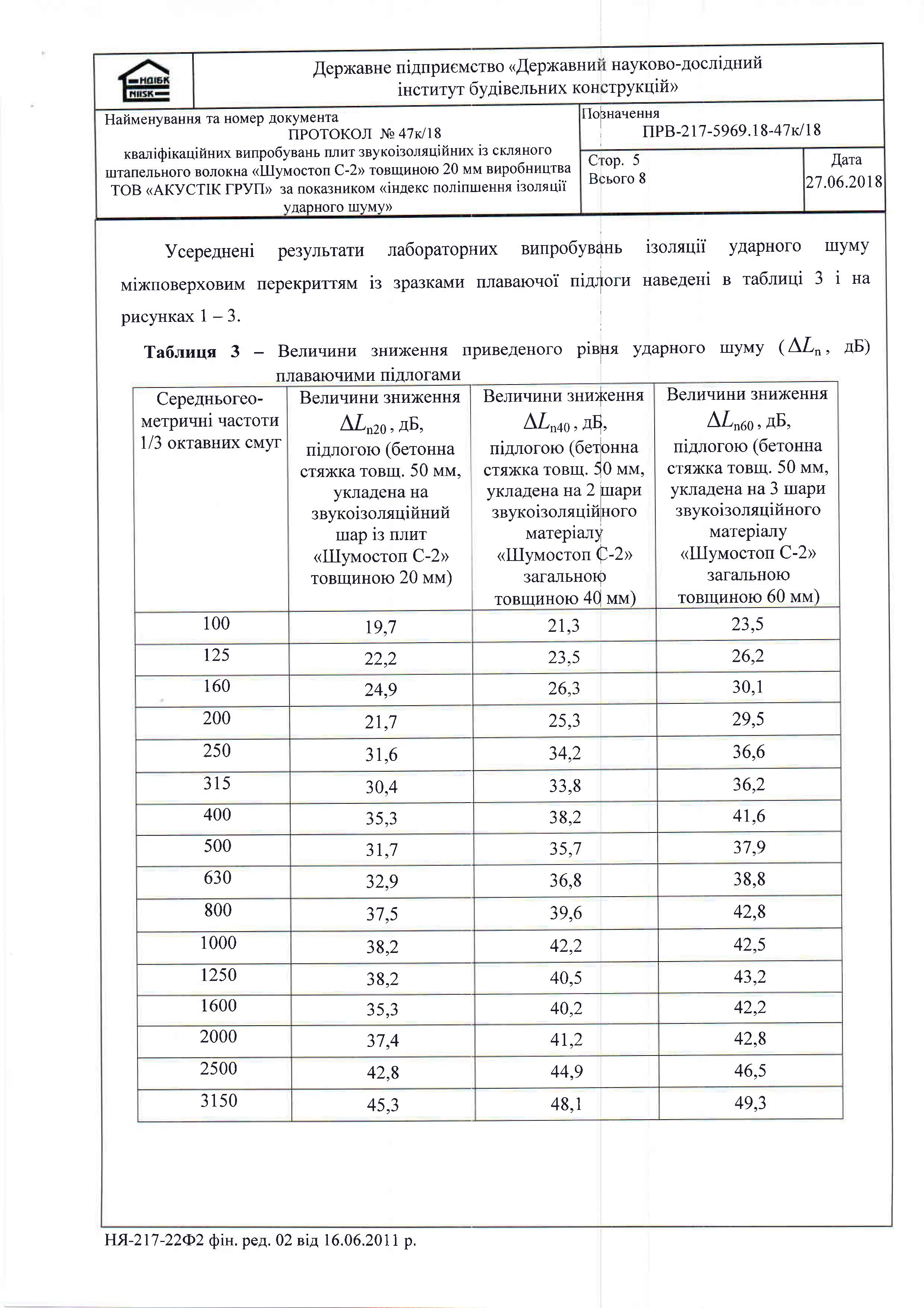 | Снижение приведенного уровня ударного шума ΔLn плавающей стяжкой, уложенной на один слой ШУМОСТОП-C2, дБ | 37,4 | 35,8 | 40,8 | 43,4 | 45,5 | 50,0 | 57,3 | 61,0 |