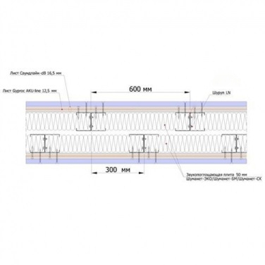 Складається з двох шарів звукопоглинаючих плит Шуманет-ЕКО, акустичного триплекса Саундлайн-dB, фінішних листів Саундлайн-ГКЛА, віброізоляційної стрічки Вібростек-М 100 в два ряди, герметика Акуфлекс-ВС, металевих профілів CW50 та UW50.