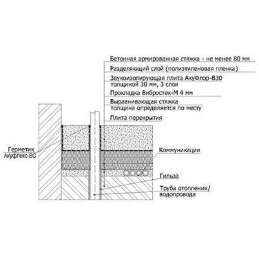 Конструкція складається з шару армованої цементно-піщаної стяжки товщиною не менше 80 мм, яку поклали на звукоізоляційні плити Акуфлор-S20, які покладені в 3 шари.