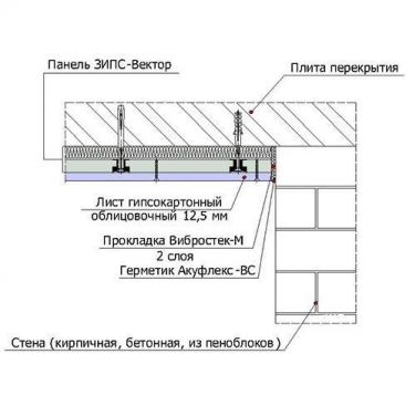 Конструкція звукоізоляційного безкаркасного облицювання складається з повністю готових до застосування сендвіч-панелей ЗІПС-Вектор товщиною 40 мм, з виконаними в них віброізолюючими вузлами кріплення, комплекту спеціального кріплення, віброізоляційної ленти Вібростек-М100, фінішних гіпсокартоних листів і герметика Акуфлекс-ВС. Панелі закріплюються шурупами до стелі через існуючі в панелях віброізолюючі вузли кріплення.