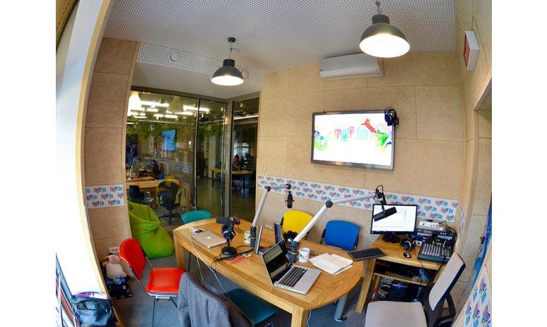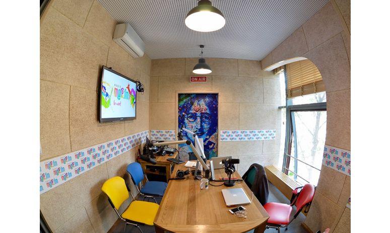 Приміщення студії влаштовано в коворкінг-центрі. Крім акустичної корекції приміщення також постало завдання влаштування звукоізоляційній скляної перегородки.